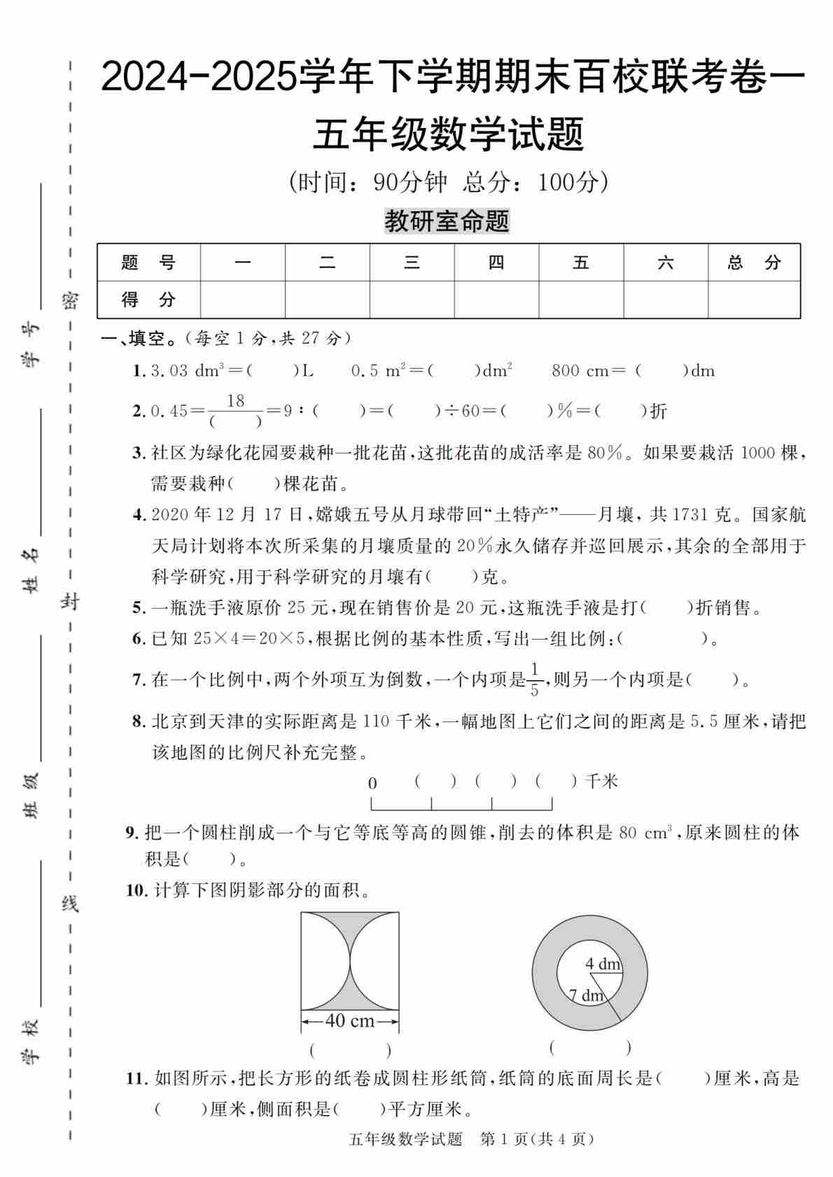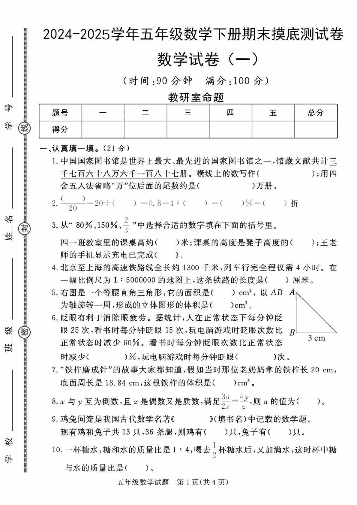 【54青岛版】24-25学年五下数学期末百校联考卷(1-9)含答案