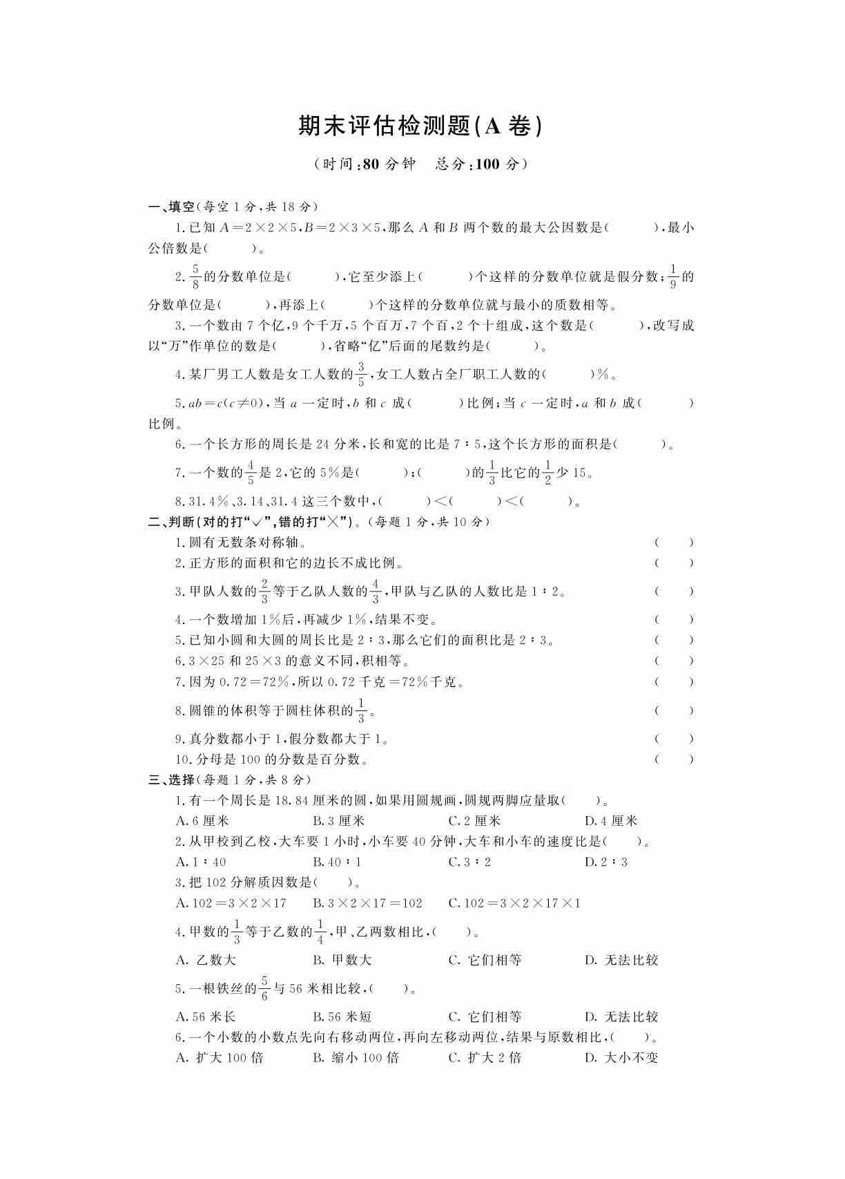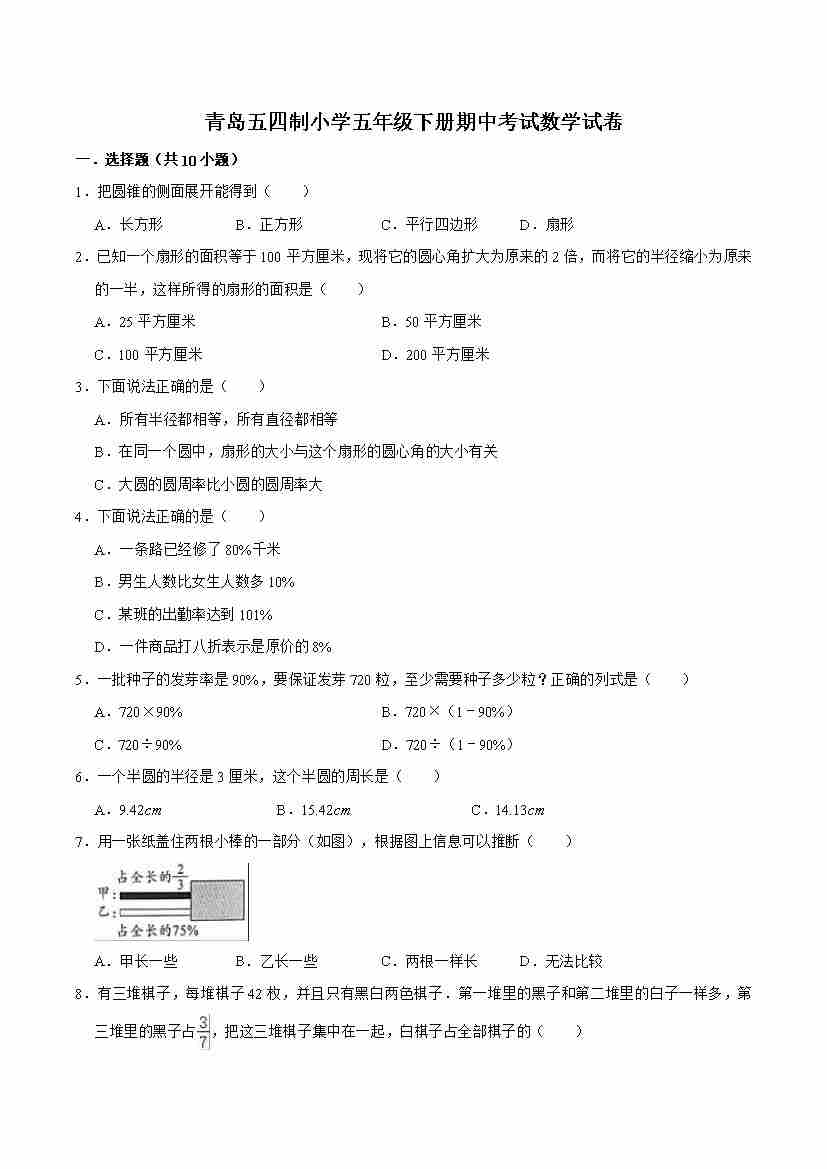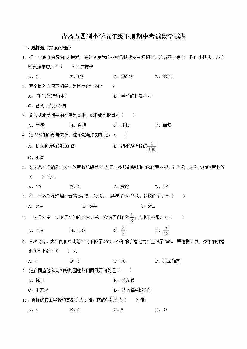 五下青岛五四制数学【期末摸底测试】