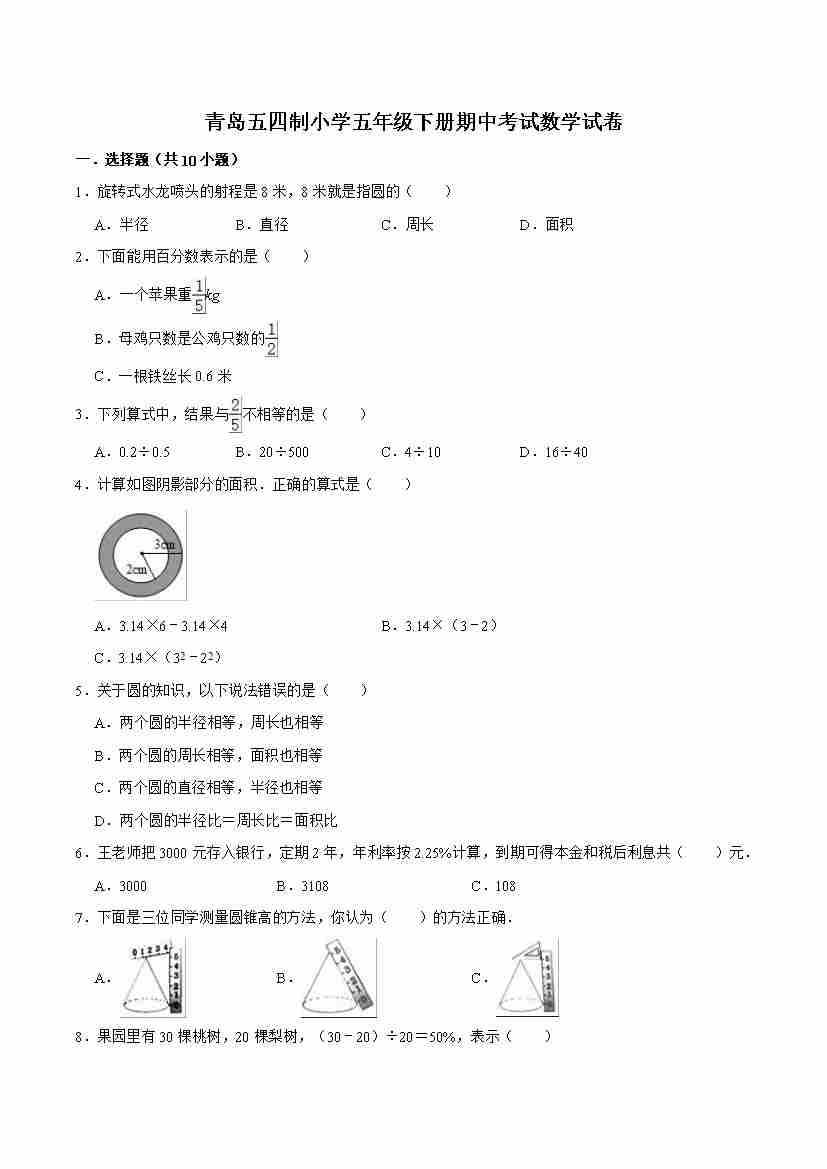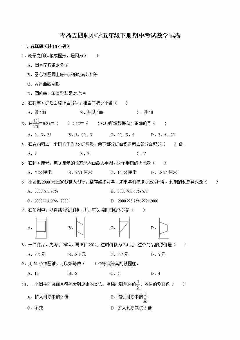 五年级下册小学数学期中测试卷(5)青岛版(五四制)(含答案)