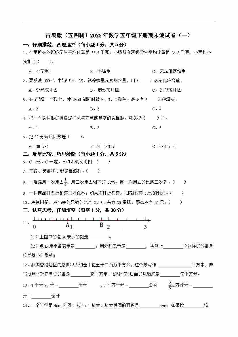 青岛版(五四制)2025年数学五年级下册期末测试卷(一)(含答案)