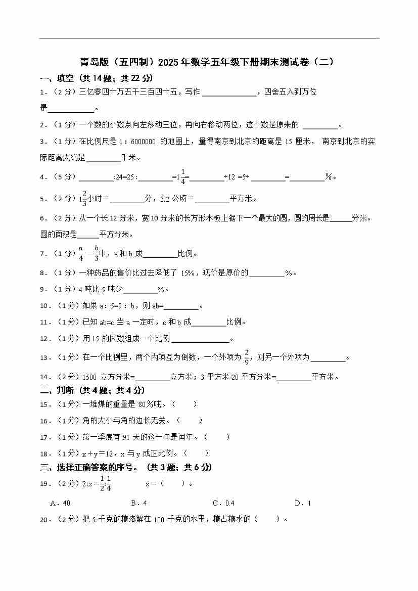 青岛版(五四制)2025年数学五年级下册期末测试卷(二)(含答案)