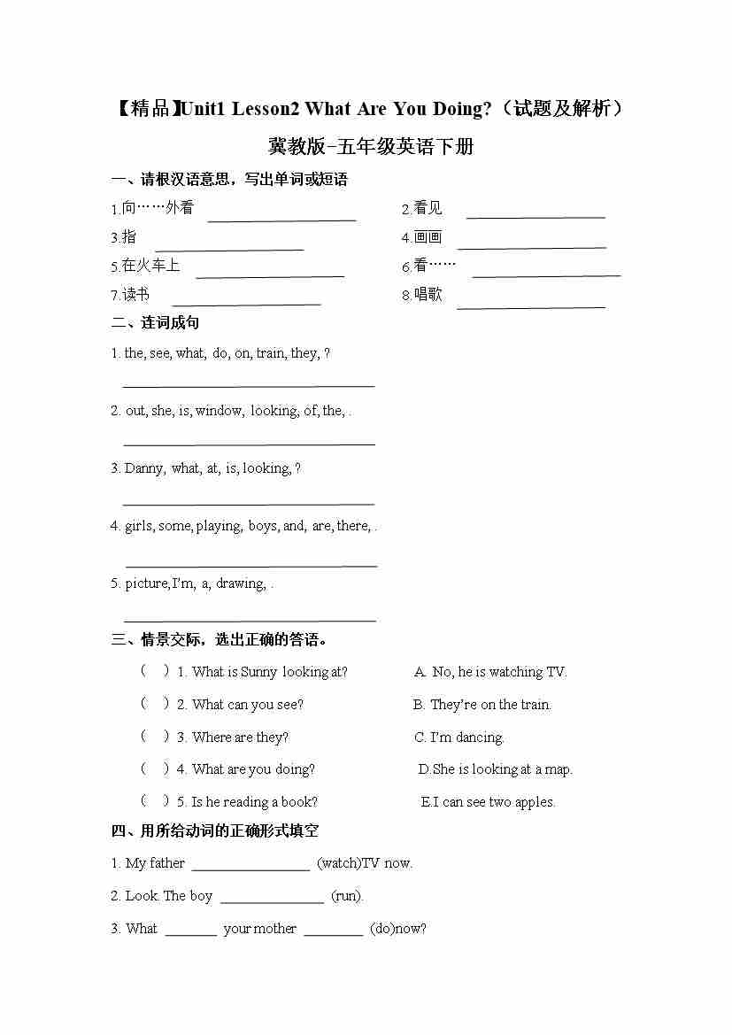 冀教版 五年级下册英语-Unit1 Lesson2 What Are You Doing (word,含答案和解析)