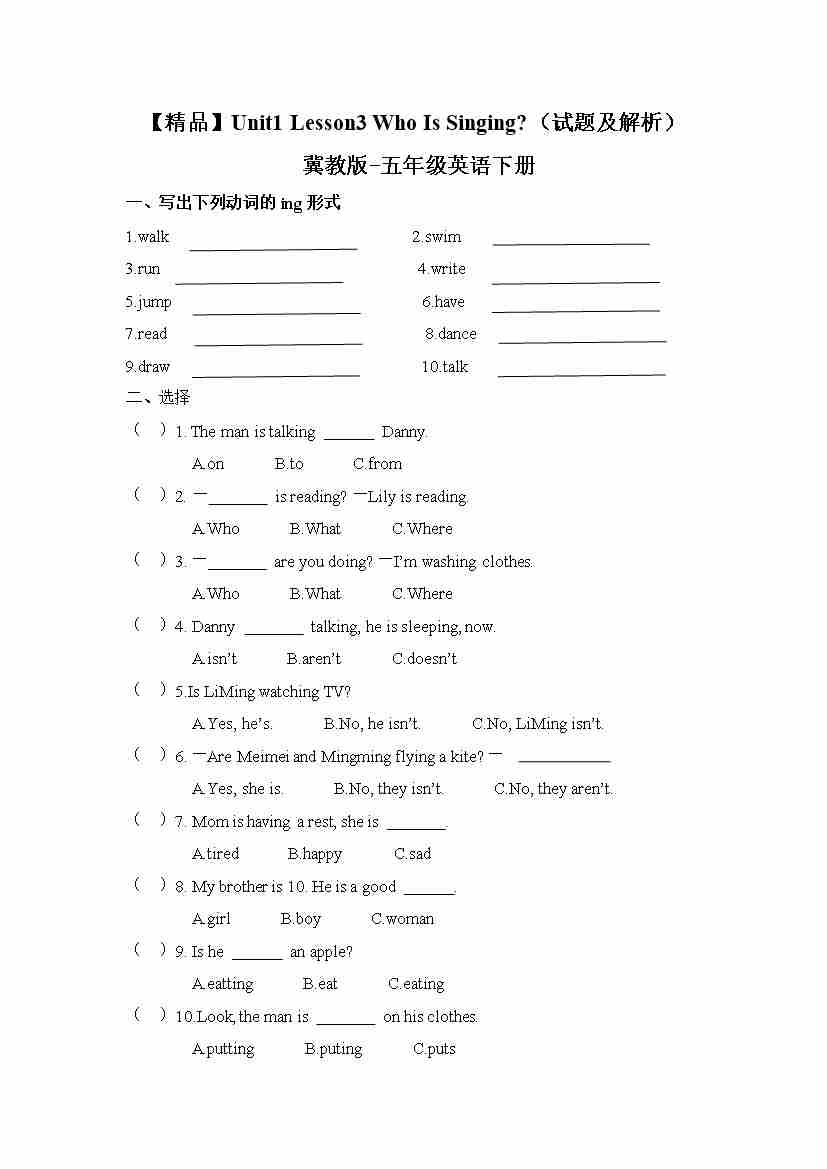 冀教版 五年级下册英语-Unit1 Lesson3 Who Is Singing (word,含答案和解析)