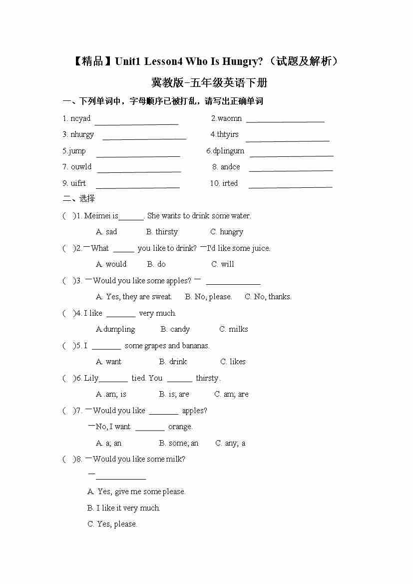 冀教版 五年级下册英语-Unit1 Lesson4 Who Is Hungry (word,含答案和解析)