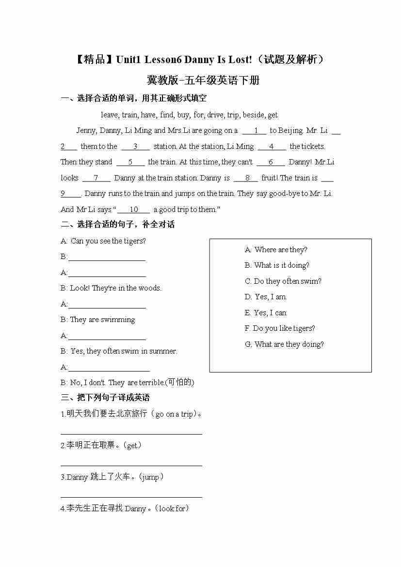 冀教版 五年级下册英语-Unit1 Lesson6 Danny Is Lost! (word,含答案和解析)