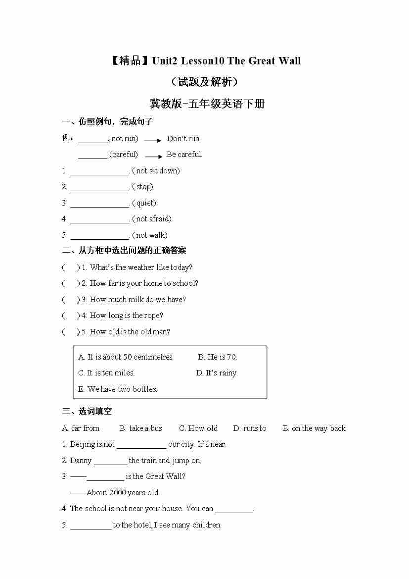 冀教版 五年级下册英语-Unit2 Lesson 10 The Great Wall (word,含答案和解析)