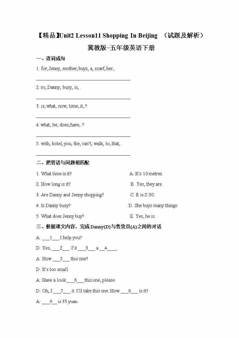 冀教版 五年级下册英语-Unit2 Lesson 11 Shopping In Beijing (word,含答案和解析)