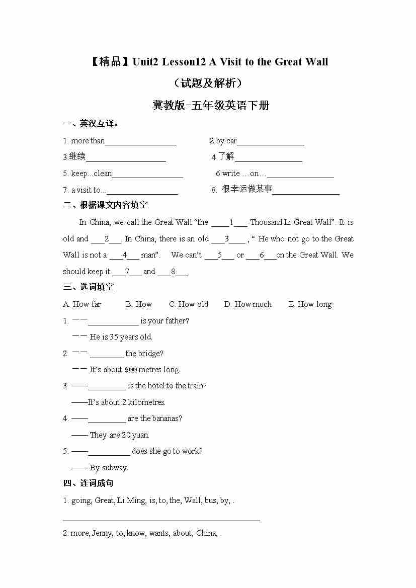冀教版 五年级下册英语-Unit2 Lesson 12 A Visit to the Great Wall (word,含答案和解析)