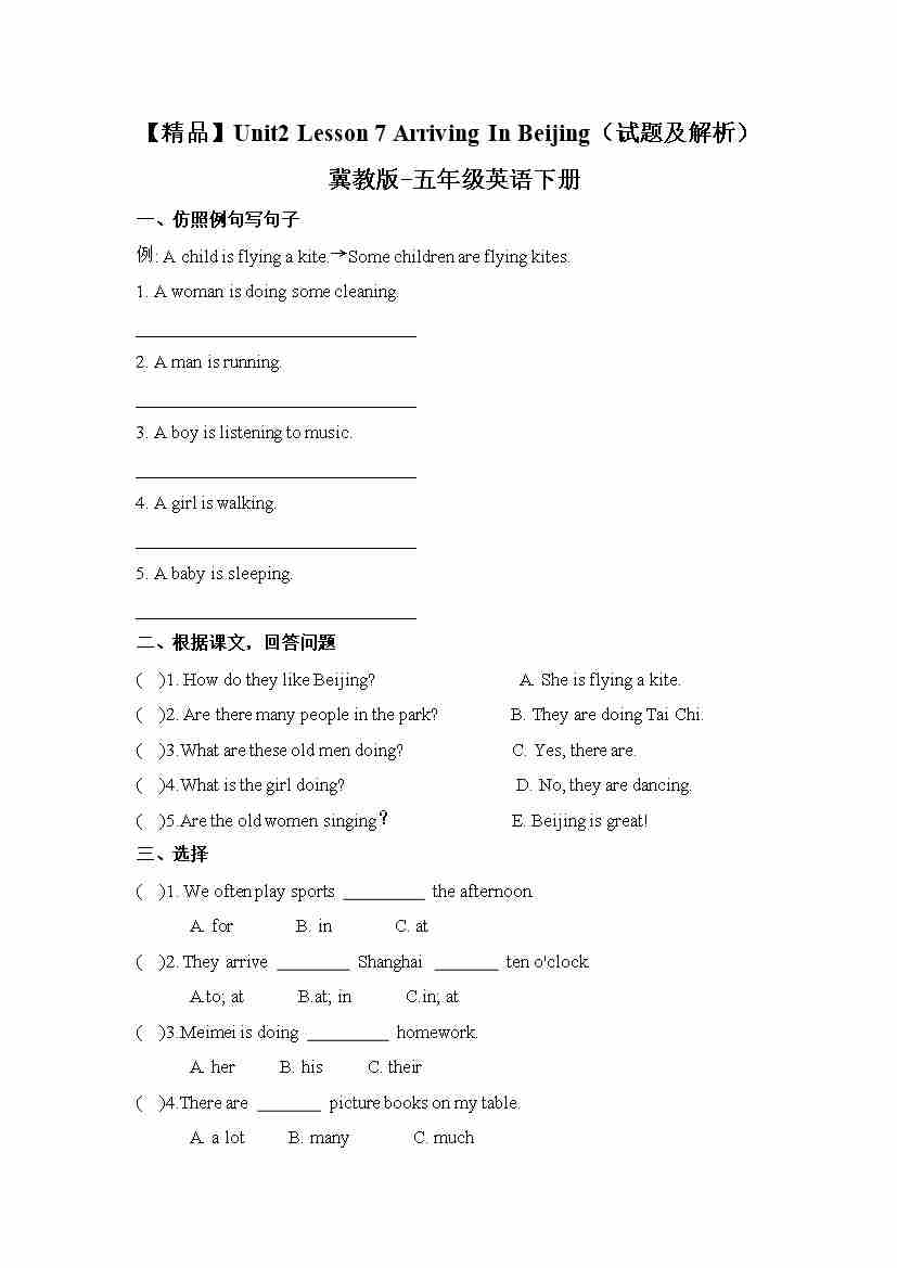 冀教版 五年级下册英语-Unit2 Lesson 7 Arriving In Beijing (word,含答案和解析)