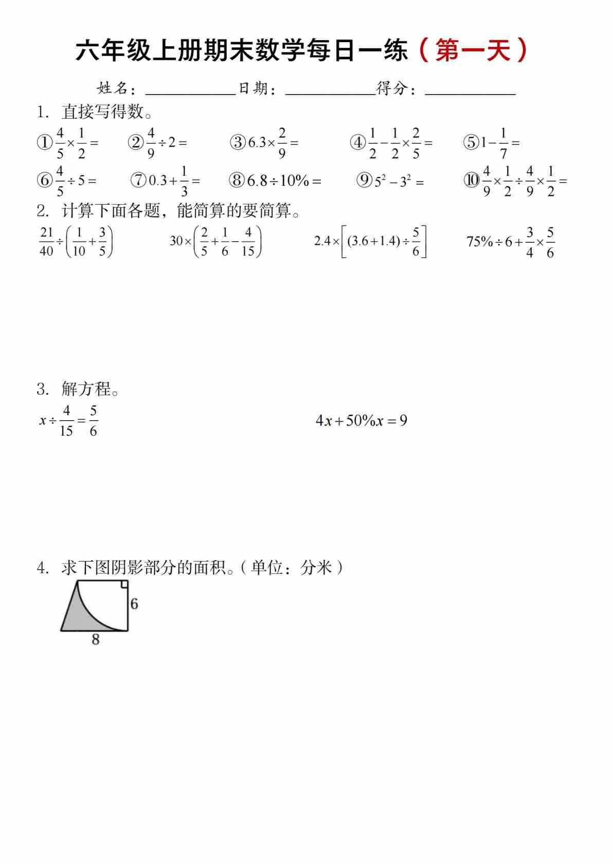 六上数学【口算竖式脱式解方程应用题60套(60页)】