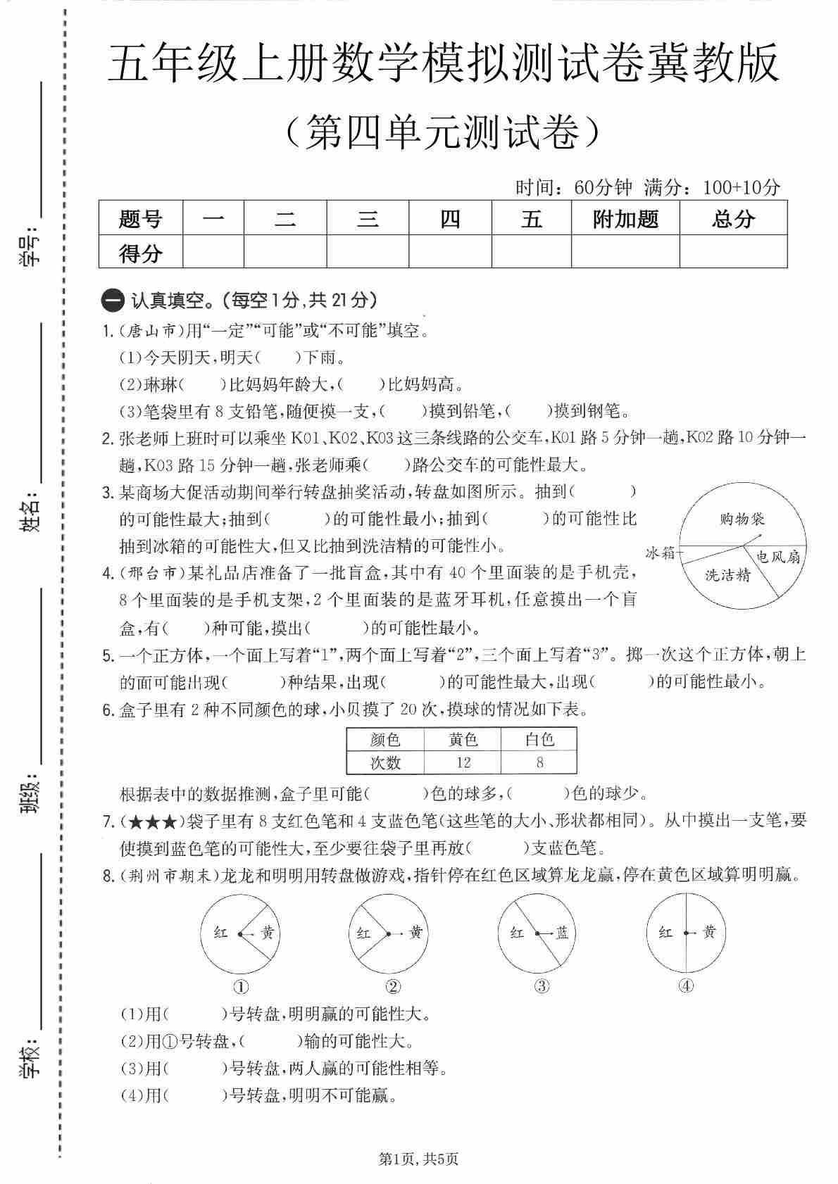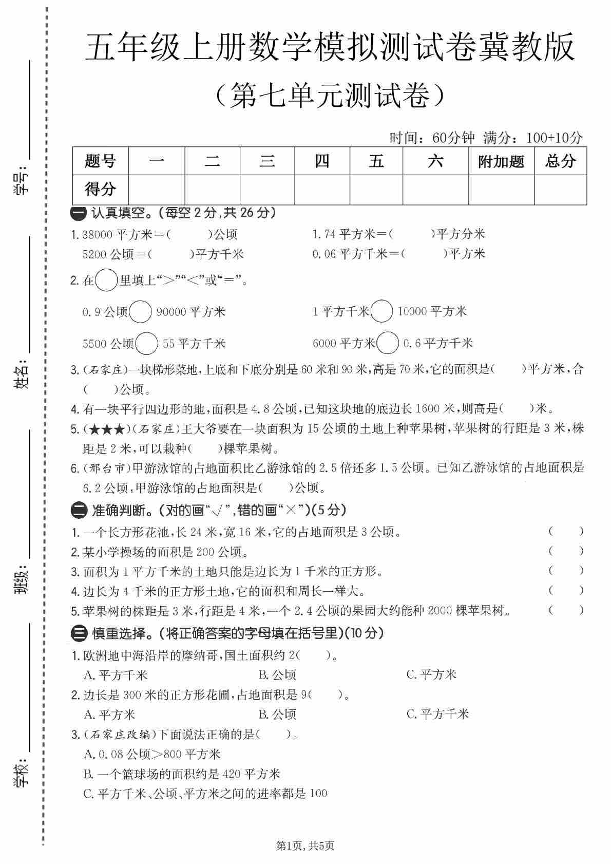五年级(上)数学第七单元测试卷《冀教版》