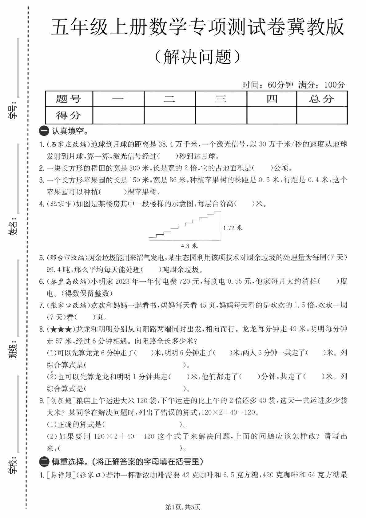 五年级(上)数学解决问题专项测试卷《冀教版》 (1)