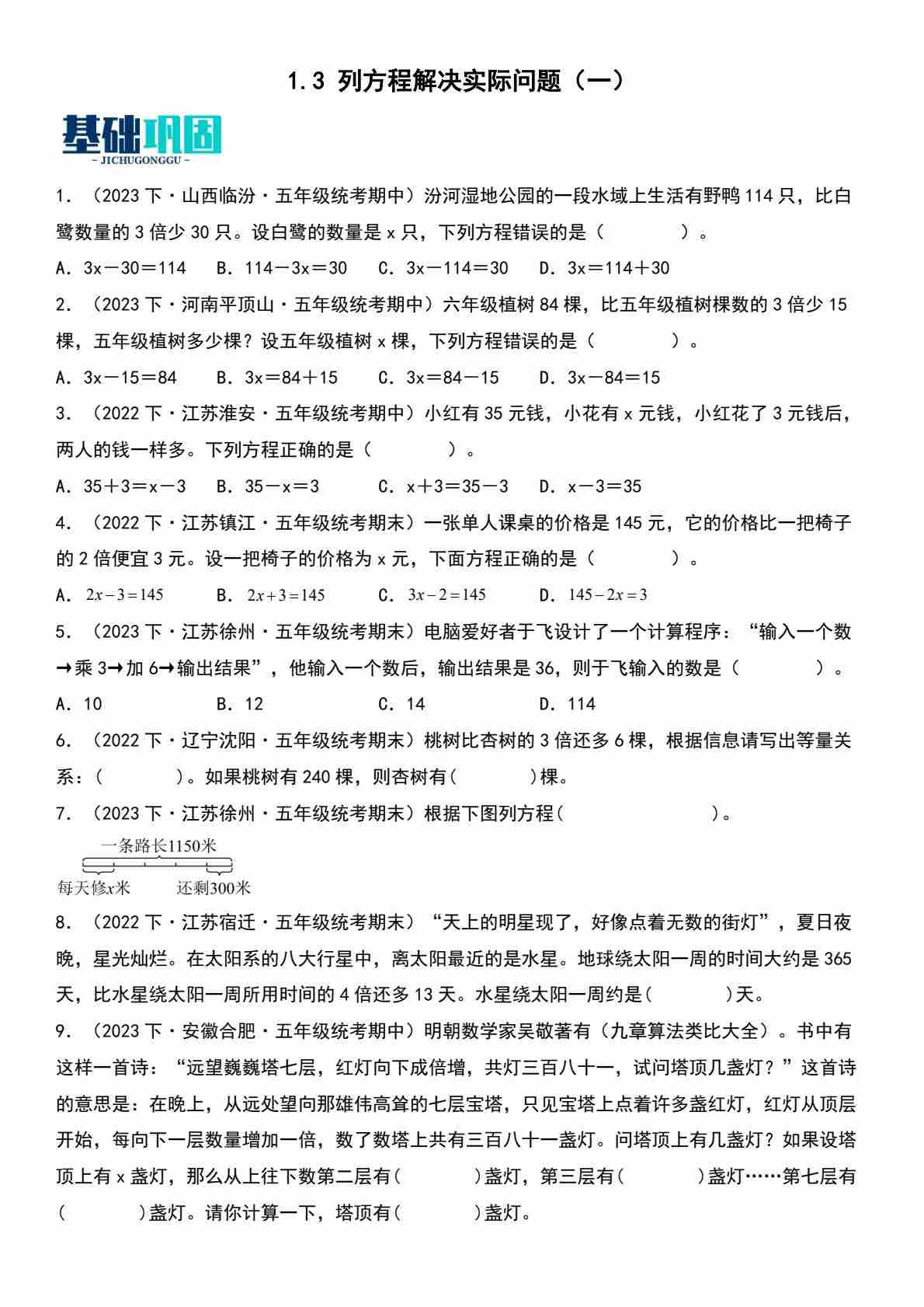 1.1 等式与方程,等式的性质1与解方程 -(分层作业)