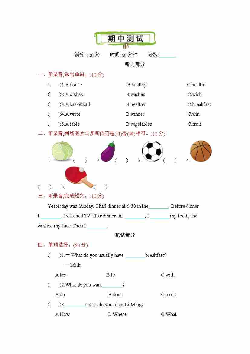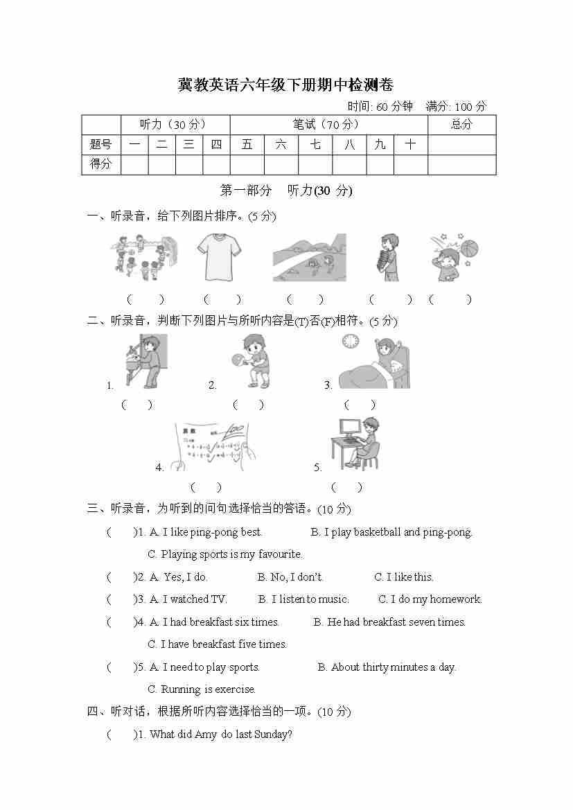 六下丨英语 期中试卷听力(冀教版)
