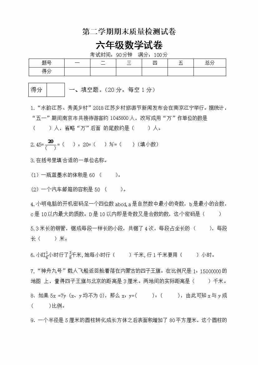 【期末提高预测卷】六年级数学下册期末质量检测卷苏教版(含答案) (1)