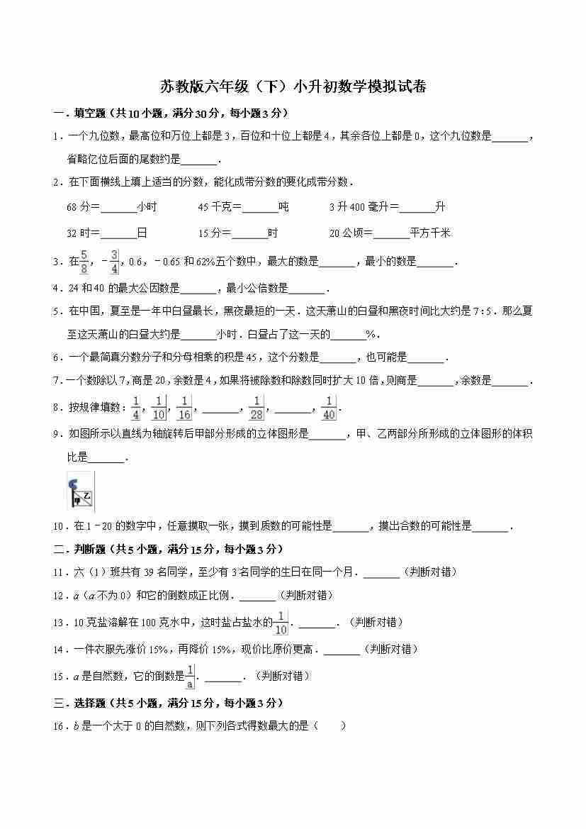 六下苏教版数学【2024-2025学年小升初全真模拟试卷(提高03)】