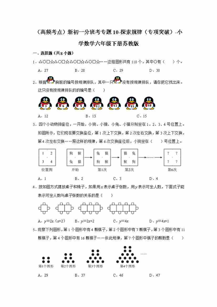(高频考点)新初一分班考专题10-探索规律(专项突破)-小学数学六年级下册苏教版