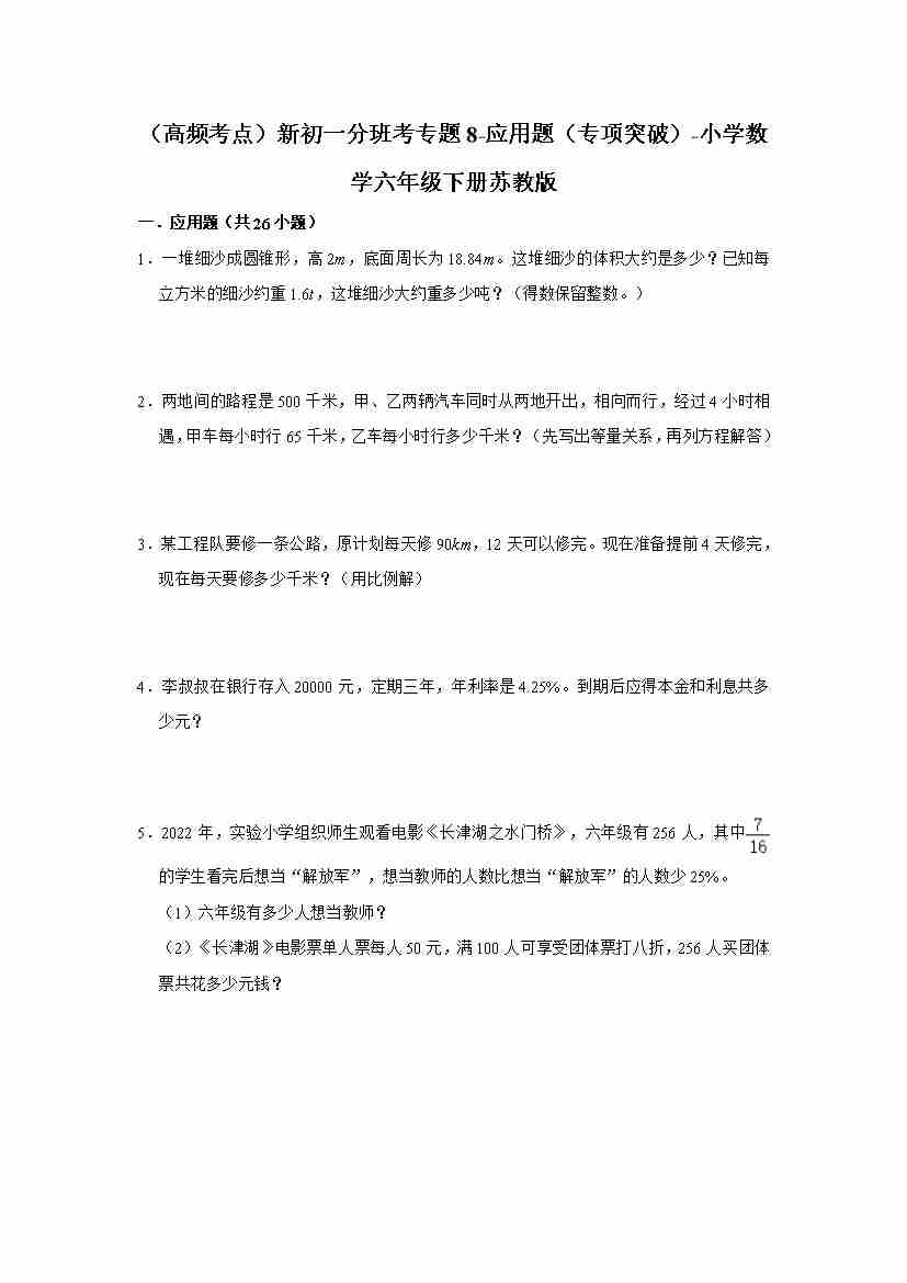 (高频考点)新初一分班考专题8-应用题(专项突破)-小学数学六年级下册苏教版