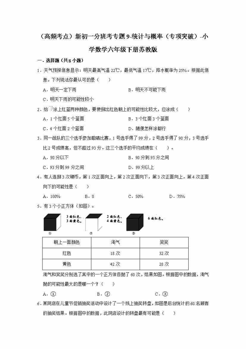 (高频考点)新初一分班考专题9-统计与概率(专项突破)-小学数学六年级下册苏教版
