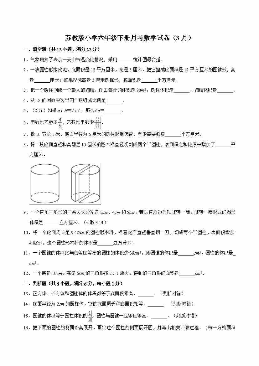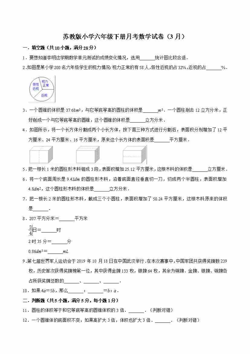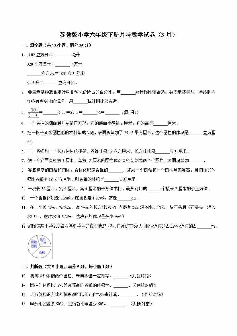 【精品】苏教版小学六年级下册月考数学试卷1(3月)(解析版)