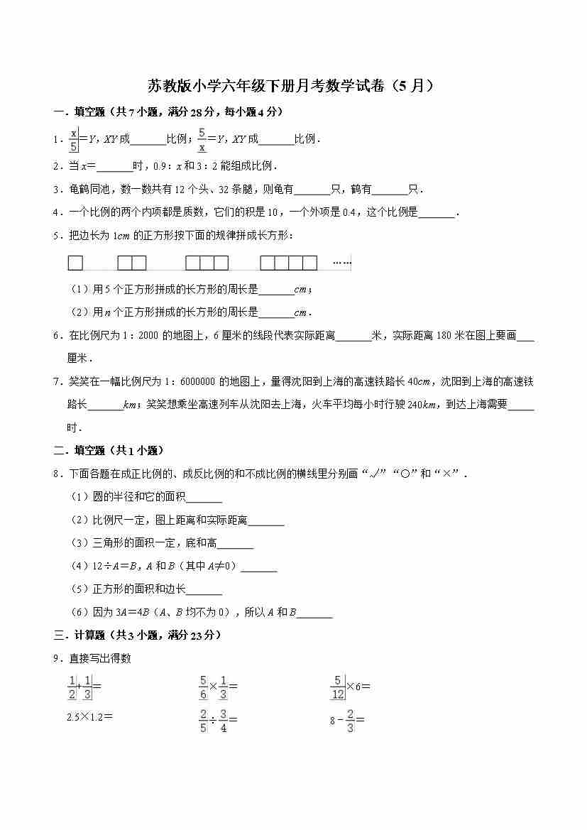 【精品】苏教版小学六年级下册月考数学试卷(5月)(解析版)