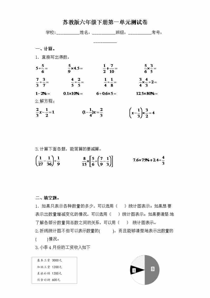 【精品单元卷】六年级下册数学单元测试-第三单元 苏教版(含答案)