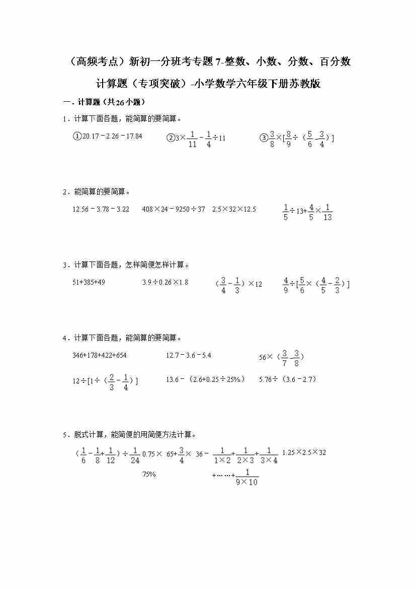 (高频考点)新初一分班考专题7-整数、小数、分数、百分数计算题(专项突破)-小学数学六年级下册苏教版