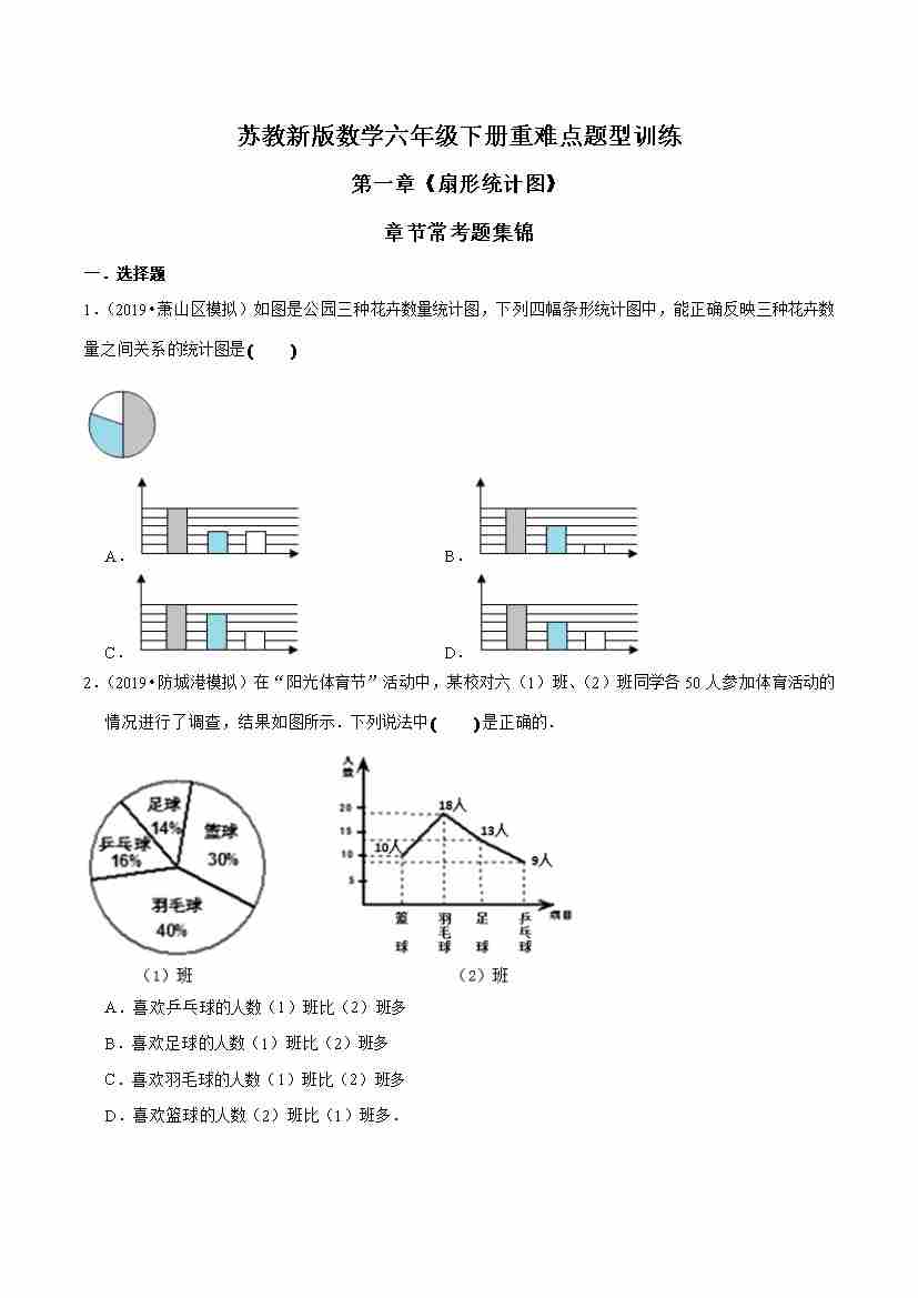 苏教新版数学六年级下册重难点题型训练第一章《扇形统计图》章节常考题集锦(原卷版)