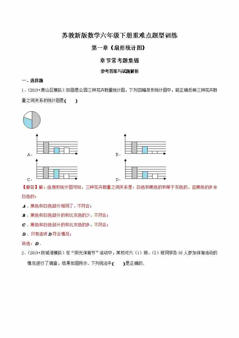 苏教新版数学六年级下册重难点题型训练第一章《扇形统计图》章节常考题集锦(解析版)