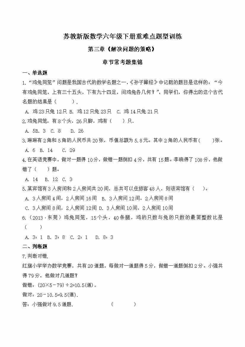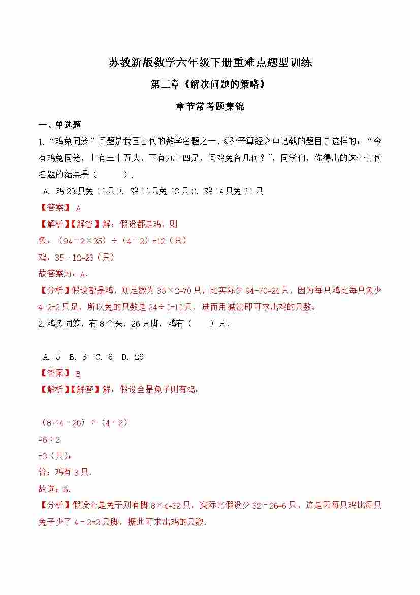 苏教新版数学六年级下册重难点题型训练第三章《解决问题的策略》章节常考题集锦(解析版)