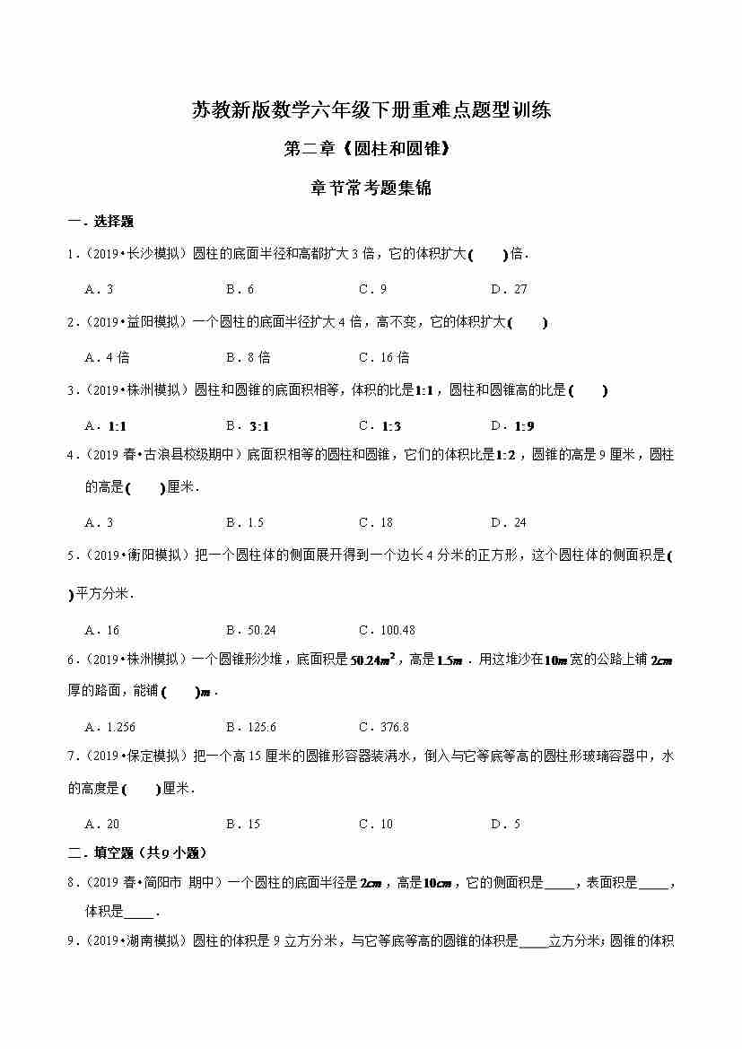 苏教新版数学六年级下册重难点题型训练第二章《圆柱和圆锥》章节常考题集锦(原卷版)