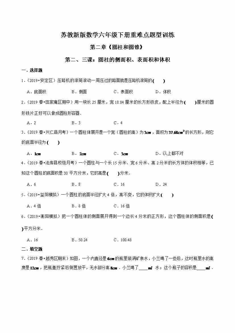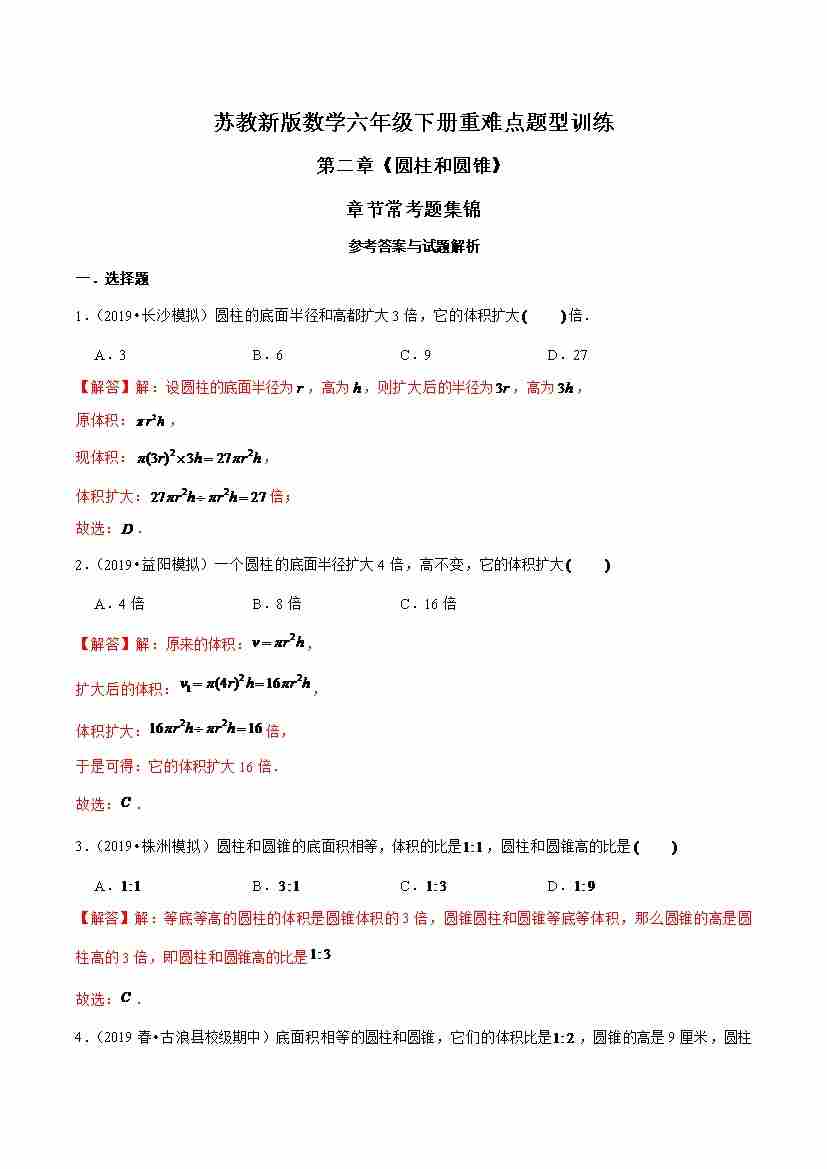 苏教新版数学六年级下册重难点题型训练第二章《圆柱和圆锥》章节常考题集锦(解析版)