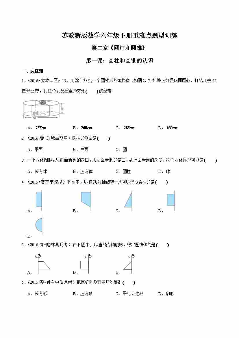 苏教新版数学六年级下册重难点题型训练第二章《圆柱和圆锥》第一课:圆柱和圆锥的认识(原卷版)