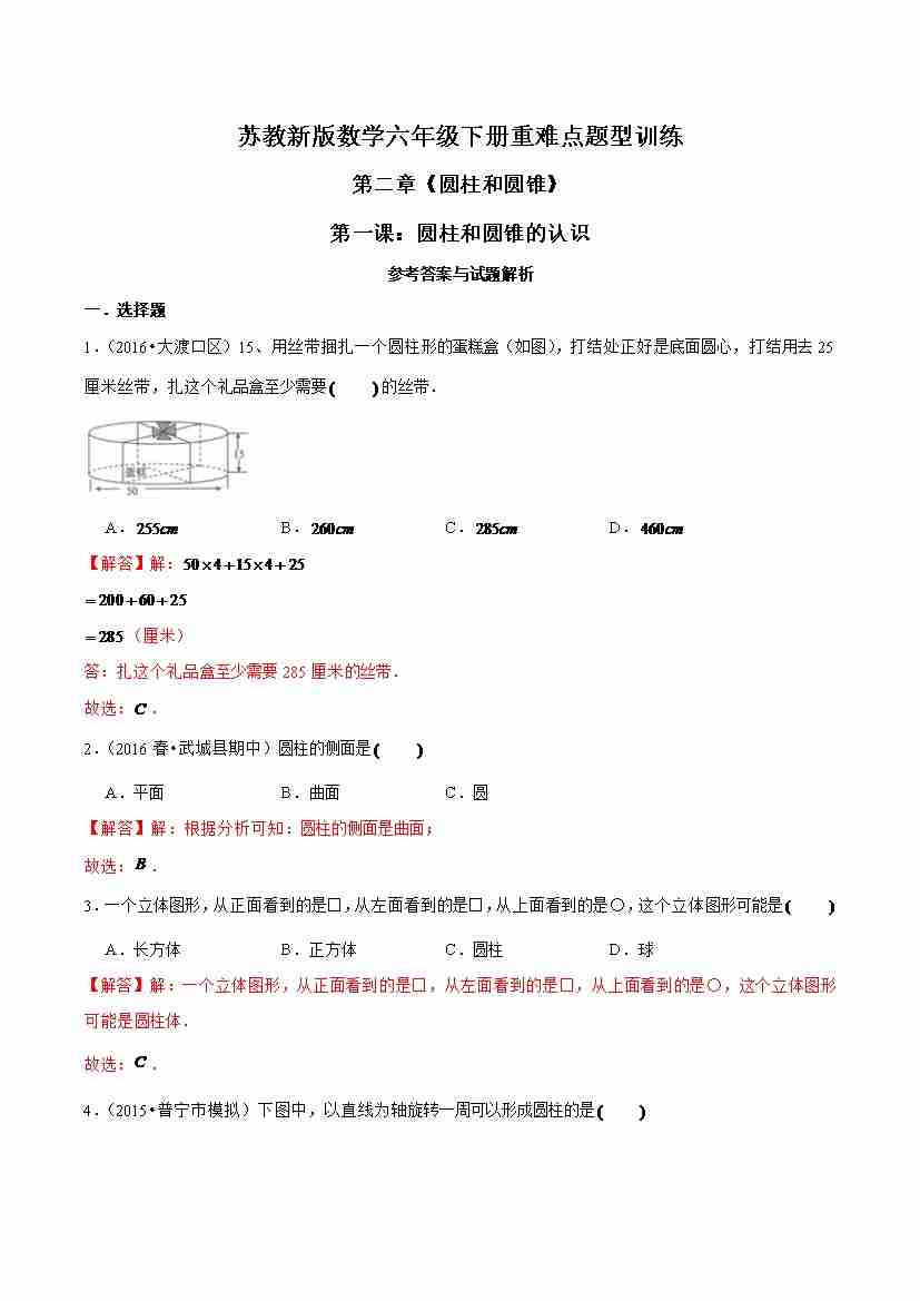 苏教新版数学六年级下册重难点题型训练第二章《圆柱和圆锥》第一课:圆柱和圆锥的认识(解析版)