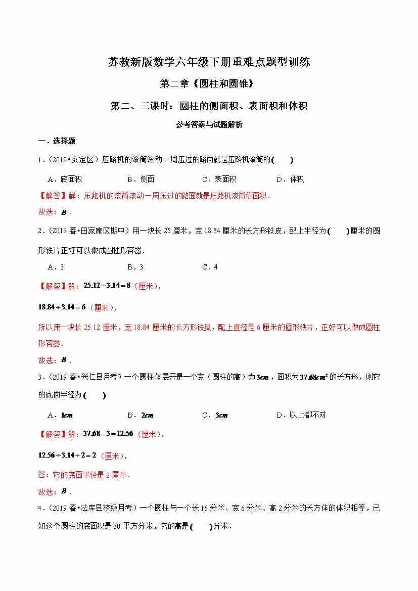 苏教新版数学六年级下册重难点题型训练第二章《圆柱和圆锥》第二、三课时:圆柱的侧面积、表面积和体积(解析版)