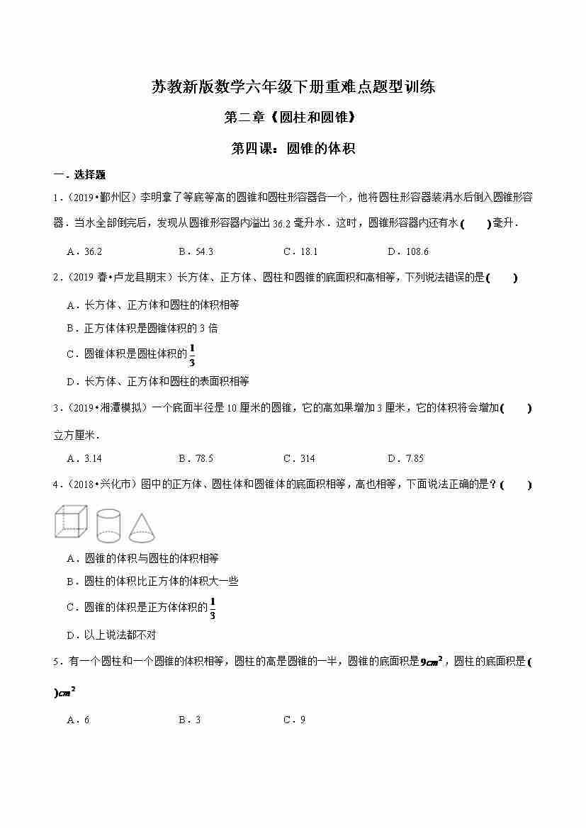 苏教新版数学六年级下册重难点题型训练第二章《圆柱和圆锥》第四课:圆锥的体积(原卷版)