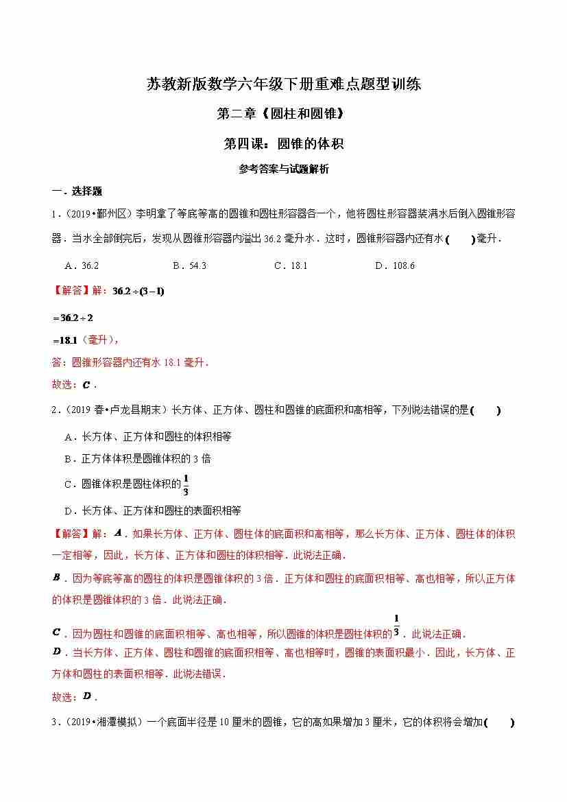苏教新版数学六年级下册重难点题型训练第二章《圆柱和圆锥》第四课:圆锥的体积(解析版)