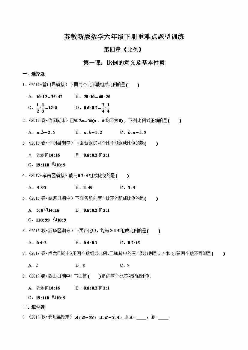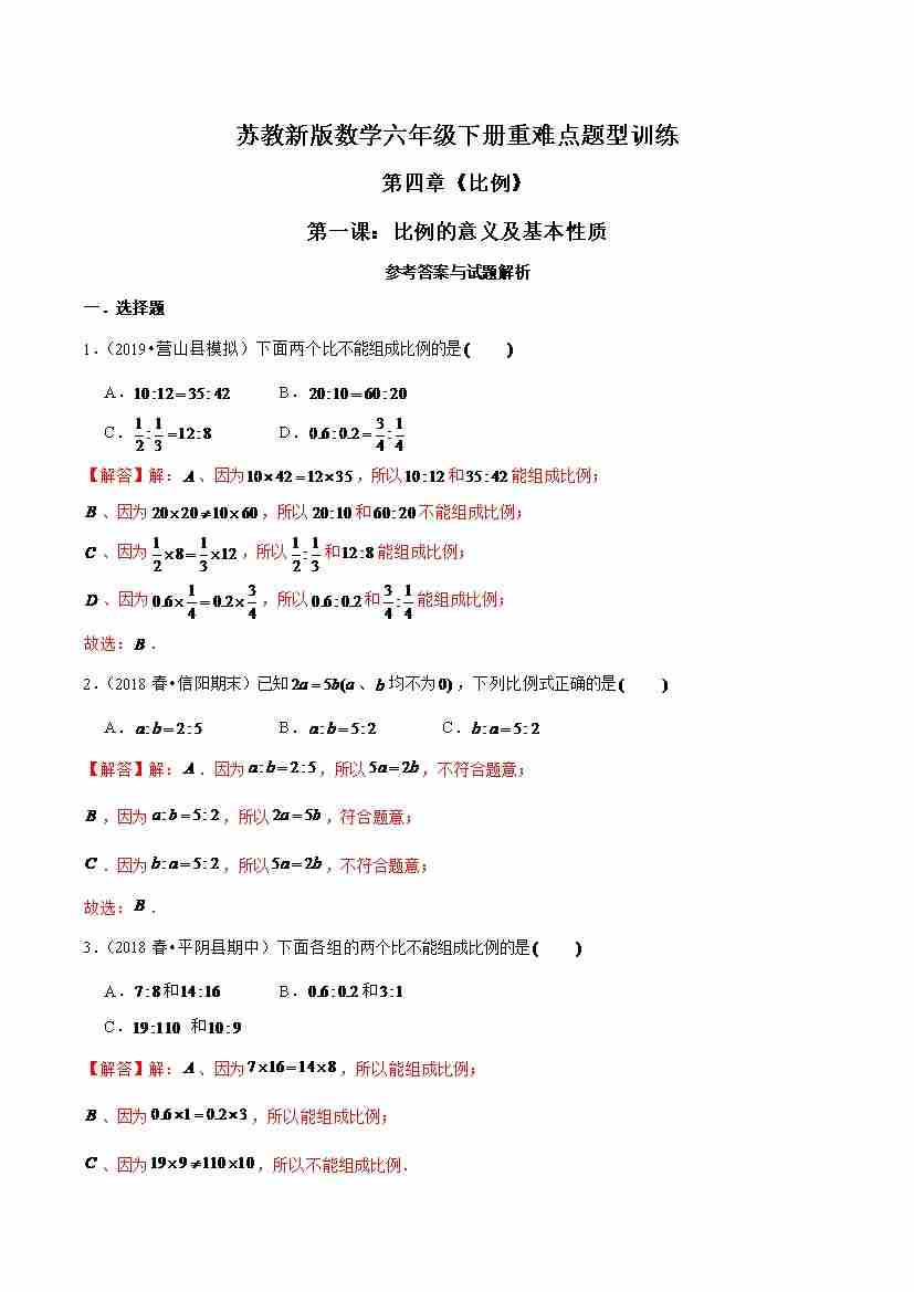 苏教新版数学六年级下册重难点题型训练第四章《比例》第一课:比例的意义及基本性质(解析版)