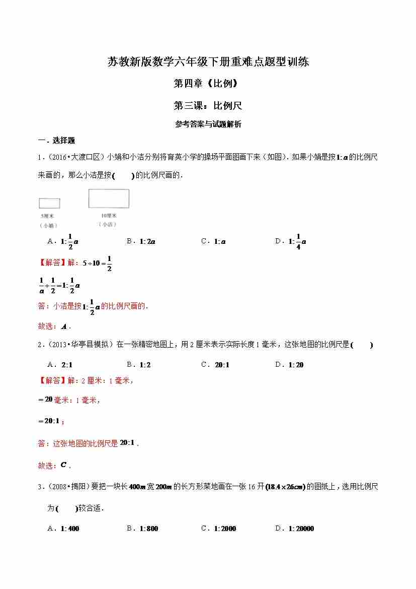 苏教新版数学六年级下册重难点题型训练第四章《比例》第三课:比例尺(解析版)