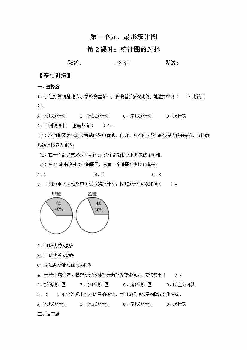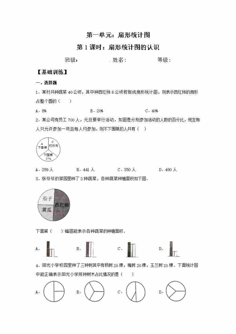 【分层训练】1.1 扇形统计图的认识 六年级下册数学同步练习 苏教版(含答案)