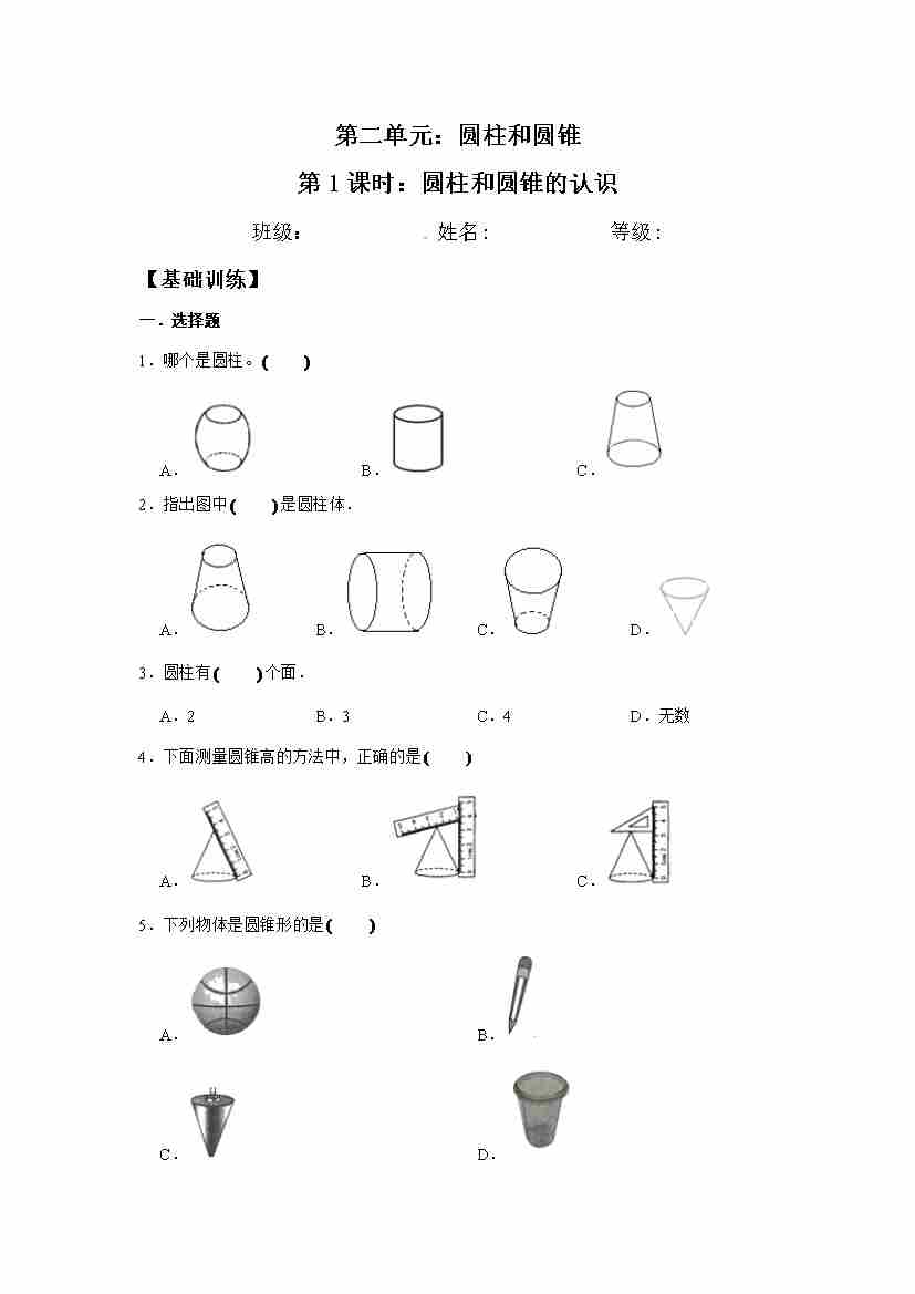 【分层训练】2.1 圆柱和圆锥的认识 六年级下册数学同步练习 苏教版(含答案)