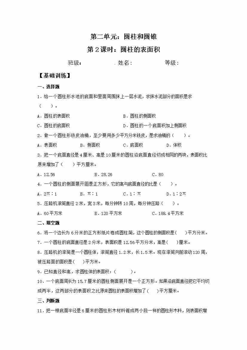 【分层训练】2.2 圆柱的表面积 六年级下册数学同步练习 苏教版(含答案)