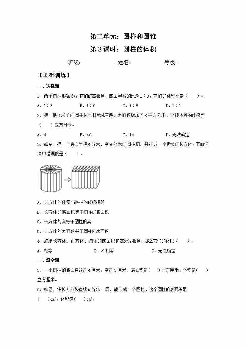 【分层训练】2.3 圆柱的体积 六年级下册数学同步练习 苏教版(含答案)