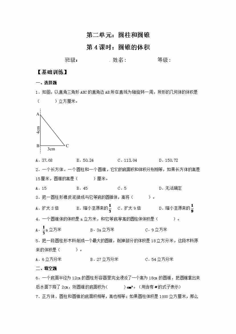 【分层训练】2.4 圆锥的体积 六年级下册数学同步练习 苏教版(含答案)
