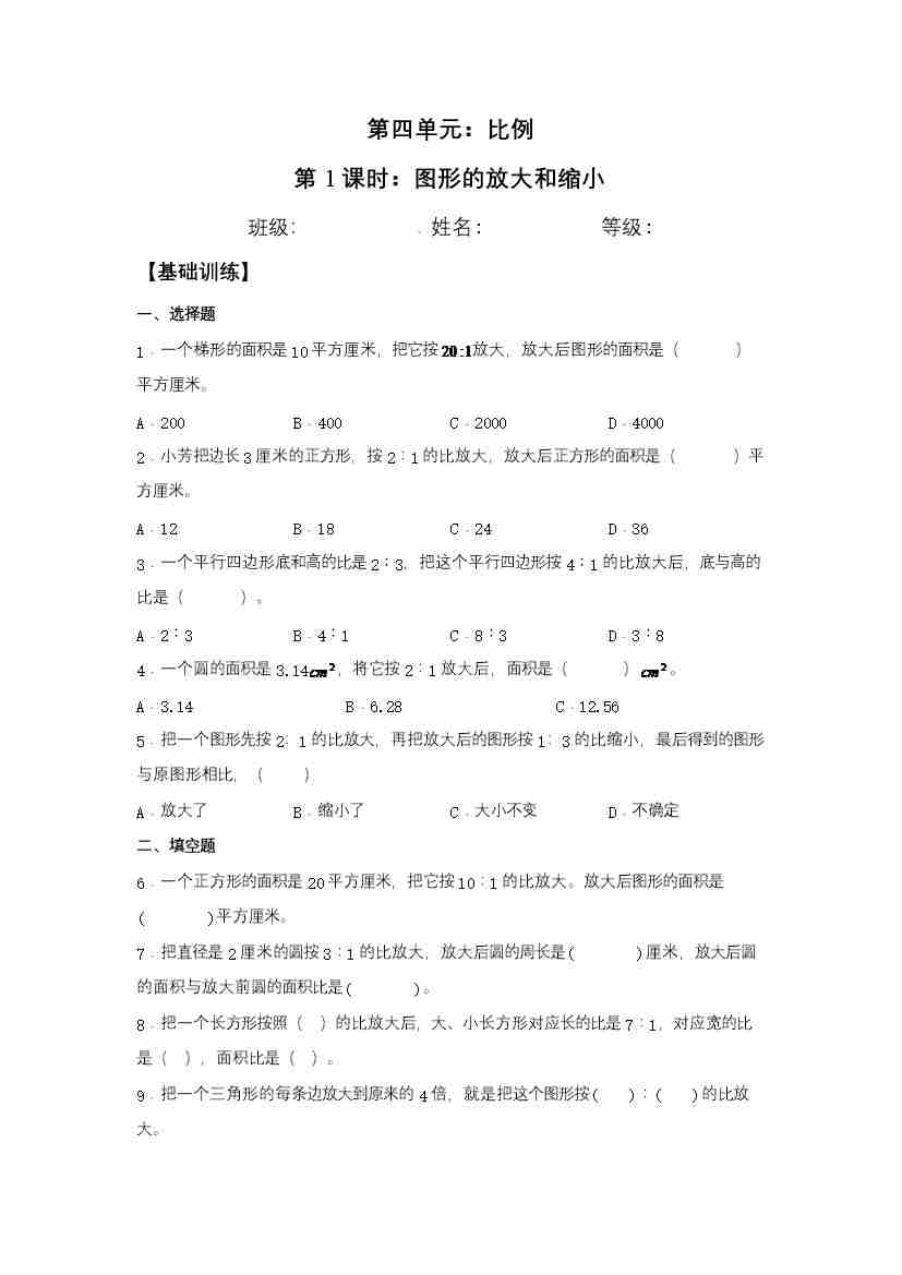 【分层训练】4.1 图形的放大和缩小 六年级下册数学同步练习 苏教版(含答案)