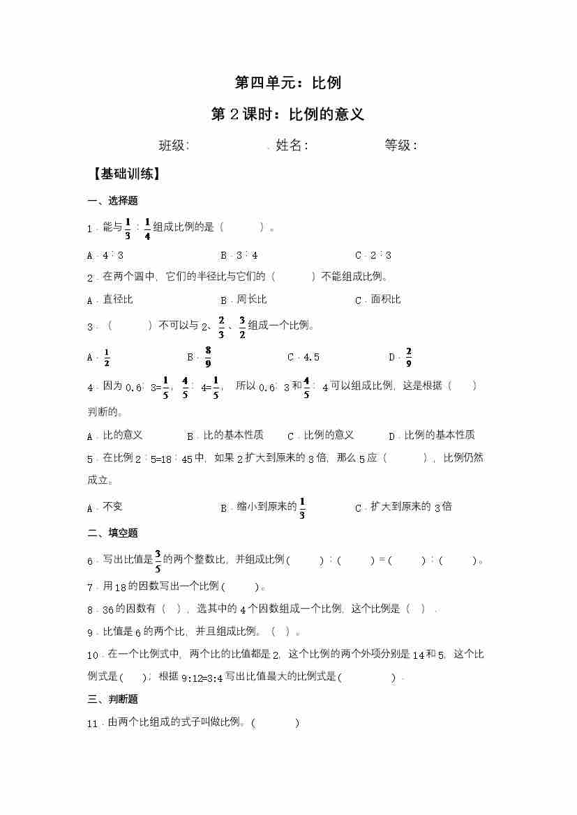 【分层训练】4.2 比例的意义 六年级下册数学同步练习 苏教版(含答案)