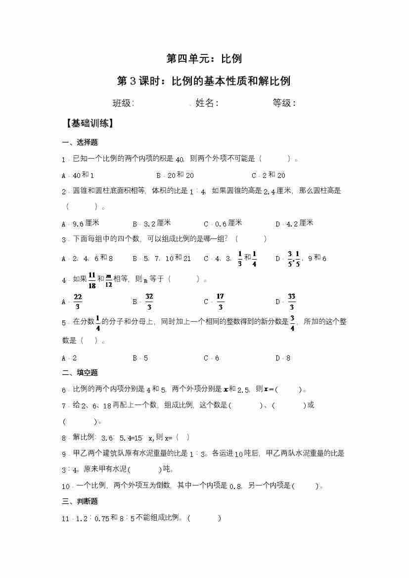 【分层训练】4.3 比例的基本性质和解比例 六年级下册数学同步练习 苏教版(含答案)