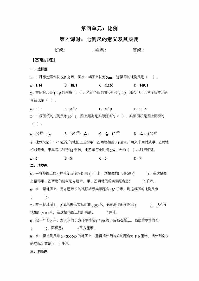 【基础+拔高】4.6比例尺-六年级下册数学一课一练 苏教版