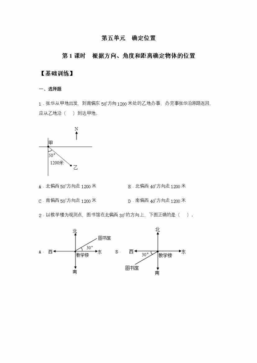 【分层训练】5.1 根据方向、角度和距离确定物体的位置 六年级下册数学同步练习 苏教版(含答案)