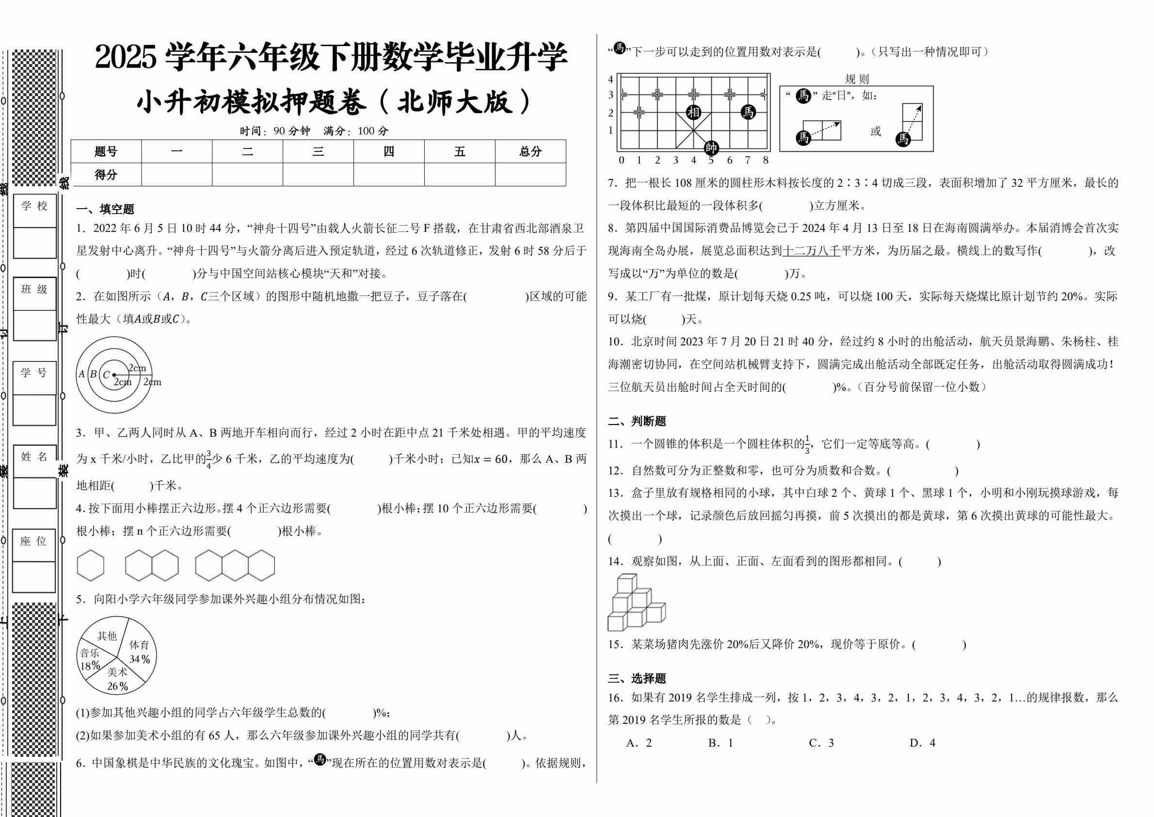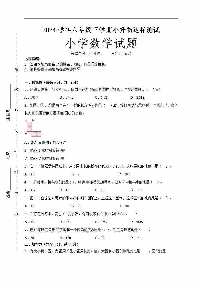 六(下)数学北师版小升初择校分班考达标测试数学试卷原卷